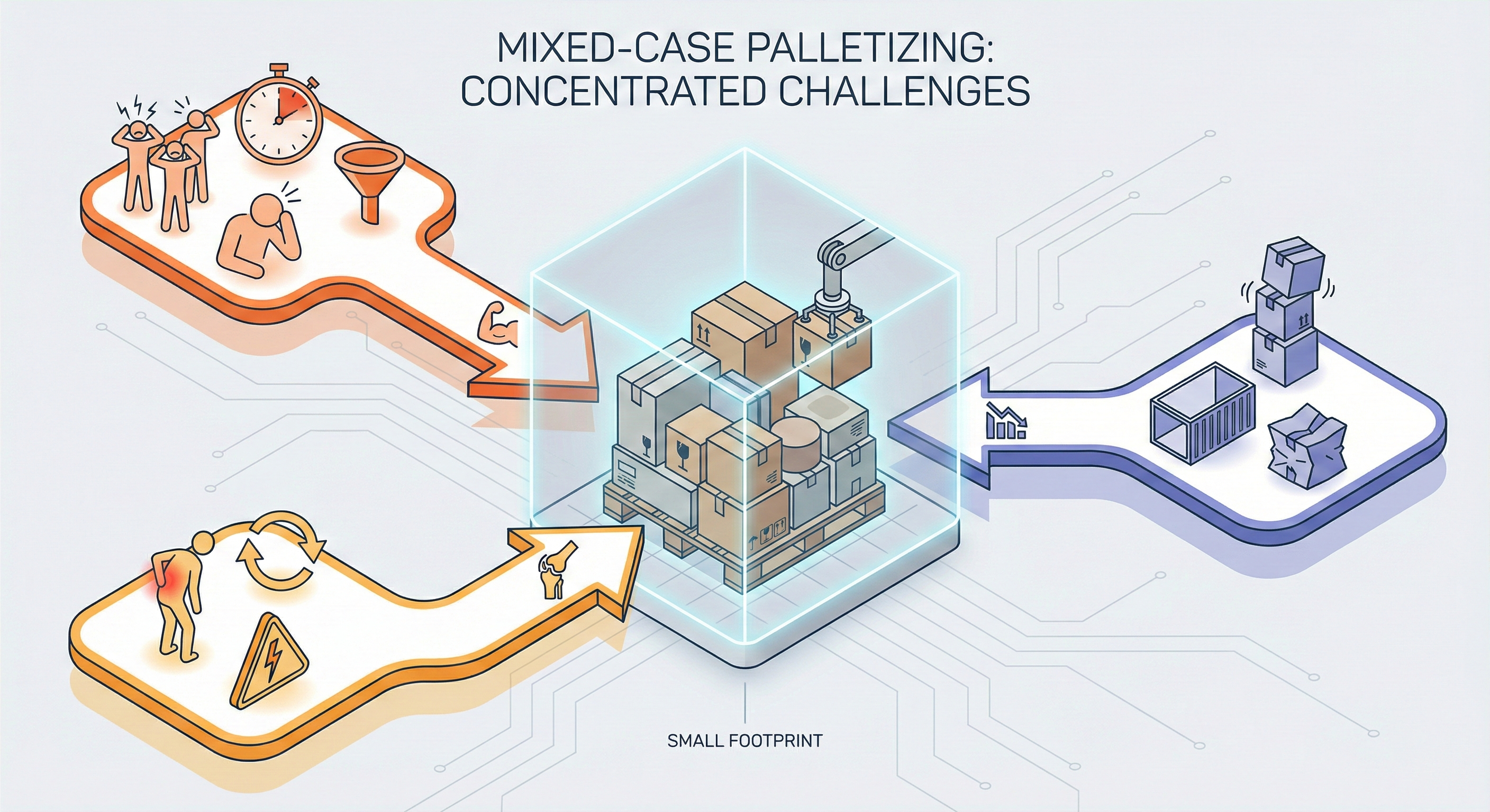 Mixed-case palletizing concentrates several hard problems into a small footprint: