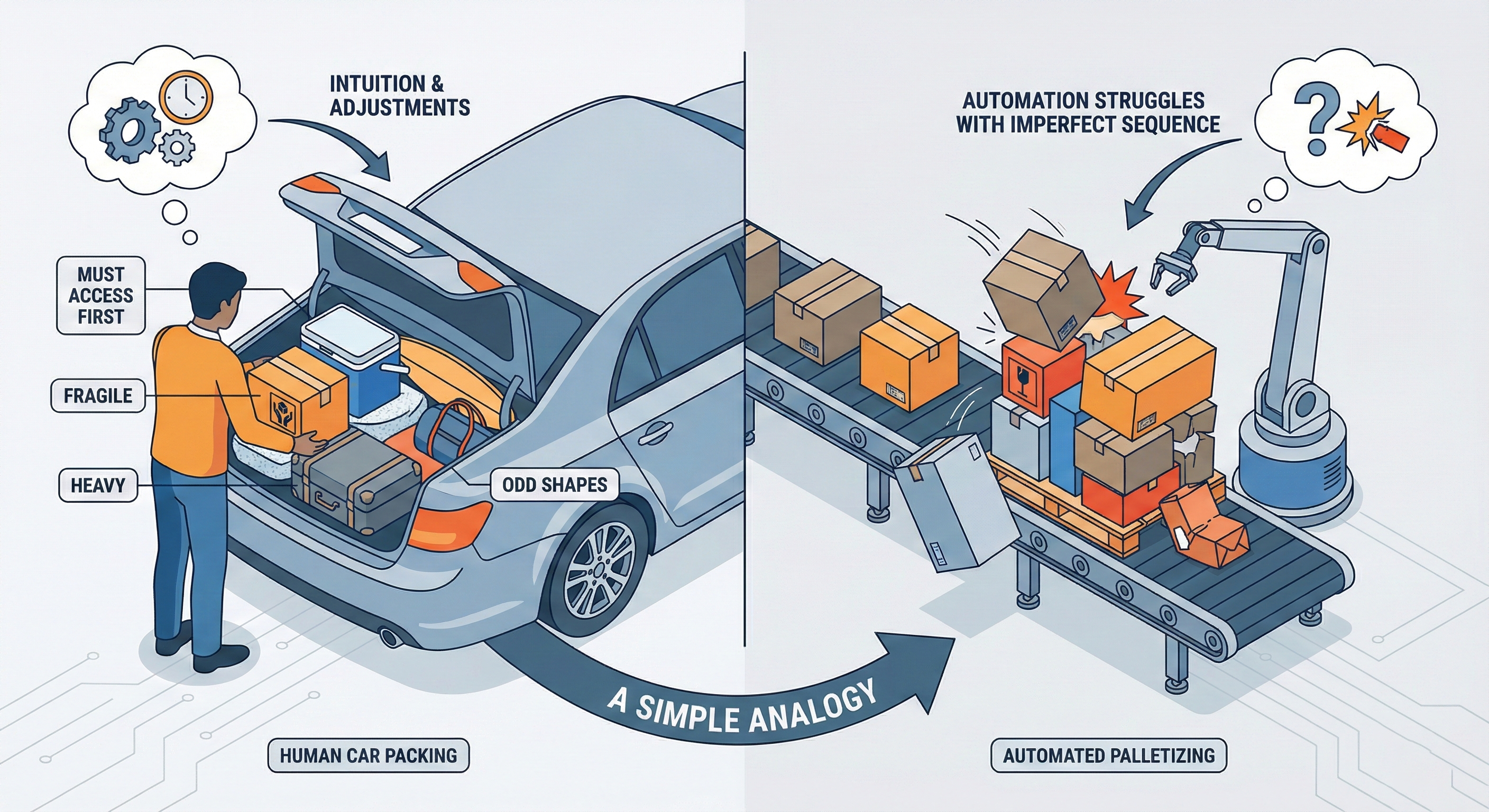 Humans solve this with intuition and micro-adjustments. Automation struggles when the incoming sequence is imperfect and constraints collide.